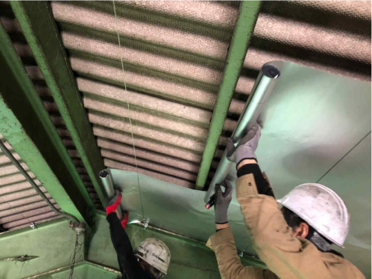 独⾃の施⼯⽅法で薄いアルミシートを取り付けていくだけなので、躯体に影響を与えにくく、建物だけでなく様々な形状の機械設備にも施⼯出来ます。